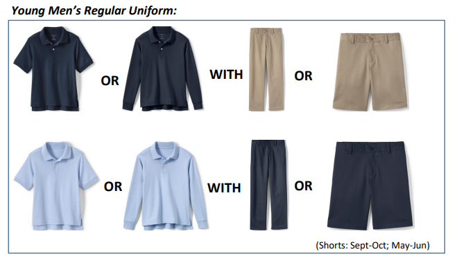 Navy Shorts are only allowed during the warmer months of September, October, May, and June.