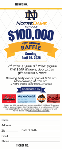 Stop by to purchase your ticket at Notre Dame Catholic Jr/High School from 8:30 am to 5 pm -or- at Notre Dame Elementary School, 11 Barton Ave., Utica from 8 am to 2 pm